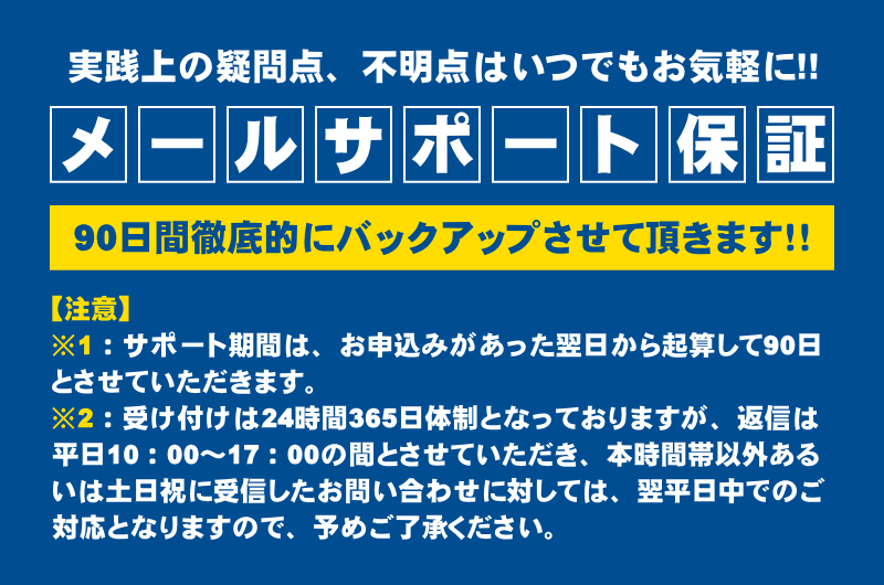 24時間365日受付のメールサポートが90日間利用できるので、有効活用してください。